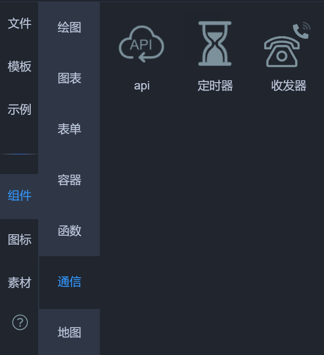 相对于界面组件,功能类的组件运行时不可见,比如工具函数、API接口、定时器、收发器等,通常与界面组件配合使用,参与逻辑和通信处理。