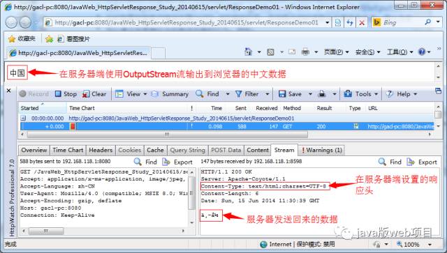 范例:使用OutputStream流向客户端浏览器输出"中国"这两个汉字