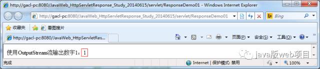 6 */ 7 public void outputOneByOutputStream(HttpServletResponse response) throws IOException{ 8 response.setHeader("content-type", "text/html;charset=UTF-8"); 9 OutputStream outputStream = response.getOutputStream();10 outputStream.write("使用OutputStream流输出数字1:".getBytes("UTF-8"));11 //outputStream.write(1);12 outputStream.write((1+"").getBytes());13 }