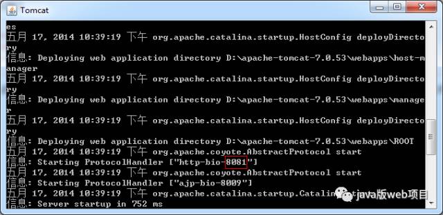 这样就把原来默认Tomcat默认的的8080端口改成了8081端口了,需要注意的是,一旦服务器中的*.xml文件改变了,则Tomcat服务器就必须重新启动,重新启动之后将重新读取新的配置信息。因为已经在server.xml文件中将Tomcat的启动端口修改成了8081,所以Tomcat服务器启动时就以8081端口启动了,如下图所示: