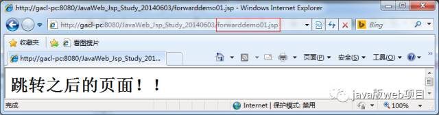 从页面的显示效果来看,页面已经完成了跳转,但地址栏没有变化,地址栏中显示的地址还是forwarddemo01.jsp,但页面显示的内容却是forwardemo02.jsp中的内容。因为此跳转属于服务器端跳转。只要是服务器端跳转,则地址栏永远没有变化。