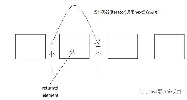 迭代器可以理解为是位于2个之间的,当调用next()方法的时候,迭代器向前移动一个位置,并返回刚刚越过的那个元素的引用。如图所示:
