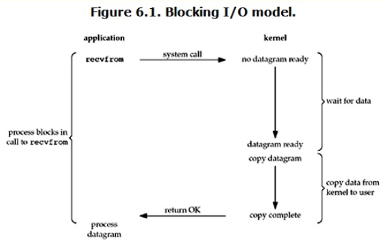 而在用户进程这边,整个进程会被阻塞。当kernel一直等到数据准备好了,它就会将数据从kernel中拷贝到用户内存,然后kernel返回结果,用户进程才解除block的状态,重新运行起来。