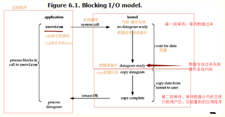当用户进程调用了recvfrom这个系统调用,kernel就开始了IO的第一个阶段:准备数据。对于network io来说,很多时候数据在一开始还没有到达(比如,还没有收到一个完整的UDP包),这个时候kernel就要等待足够的数据到来。