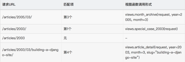 from django.conf.urls import url from app01 import views urlpatterns = [ url(r"^articles/2003/$", views.func) # func(request) url(r"^articles/(\d{4})/(\d{2})/$", views.func) # func(request, "2013", "07") ]