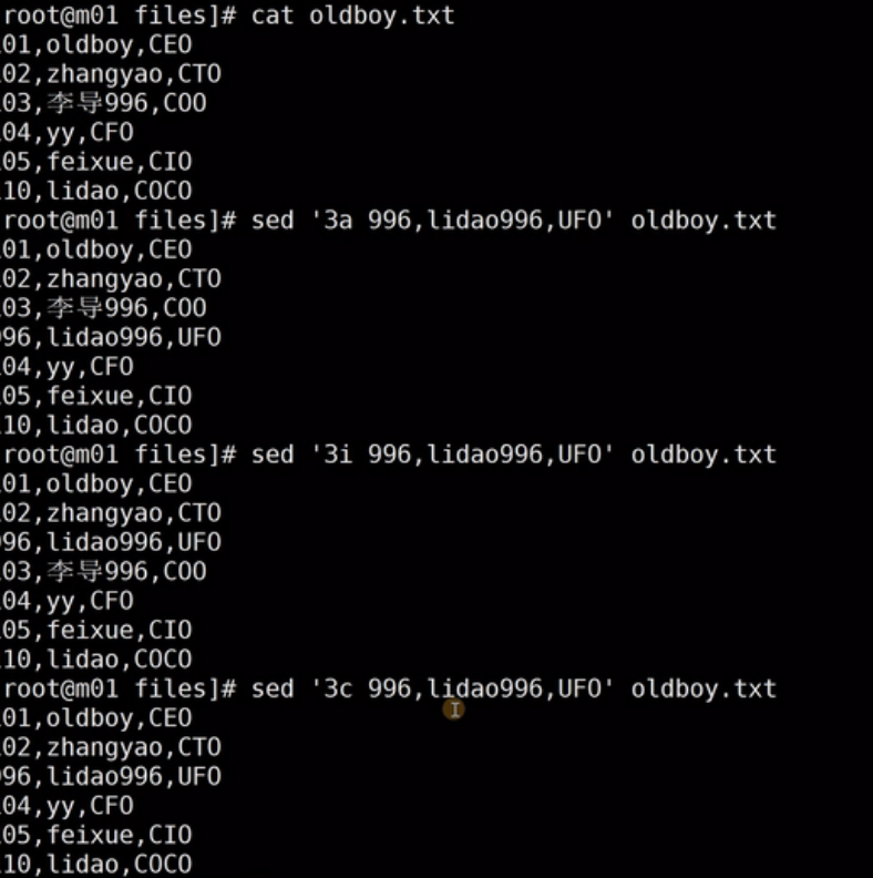 | i | insert插入,向指定的行或每一行插入内容(行后面) |