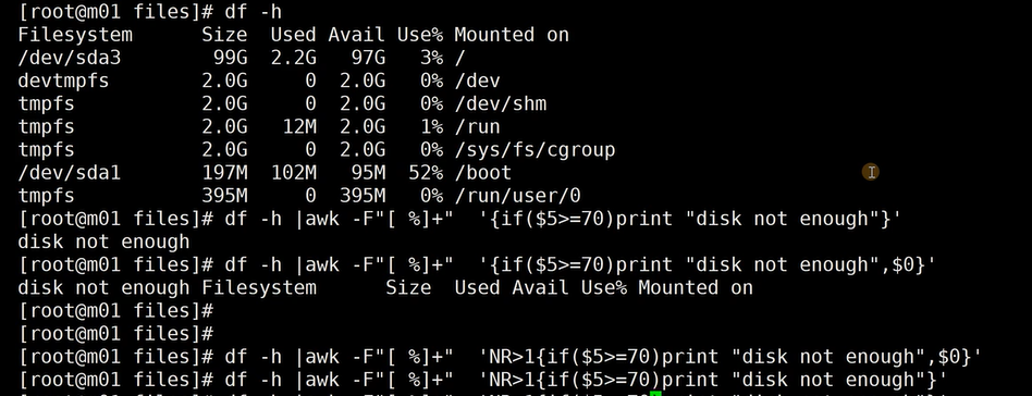 ###统计磁盘空间使用率,如果大于70%,则提示磁盘空间不足,并显示磁盘分区,磁盘使用率,磁盘挂载点