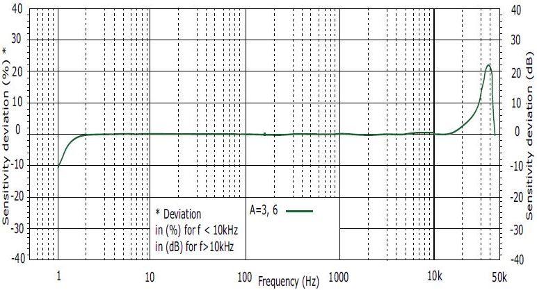 频响特性:通常加速度传感器低频特性较差,信号衰减严重,而在高频段线性度差,非线性影响严重。下图为某型号加速度计的频响曲线,从曲线图中可以看出,在2Hz以下信号衰减严重,频响性能差,在12KHz以上线性度差,其谐振频率约为38KHz。因此,该传感器的工作频率为12KHz以下。在选择加速度计时,加速度计的频率上限稍高于被测结构的振动频率即可。一般,土木工程结构的频率范围在0.2~1KHz左右,机械设备是中频段,频率范围在0.5~5KHz左右。另外,传感器的安装刚度对传感器能测的频率范围也有影响,关于这一点,请参考《传感器怎样安装才能满足测试要求,误差最小?》。