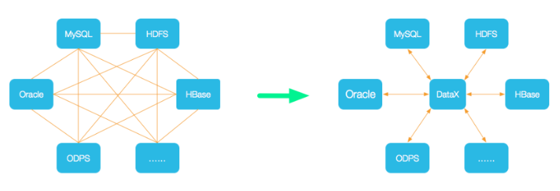 数据交换通过DataX进行中转,任何数据源只要和DataX连接上即可以和已实现的任意数据源同步。