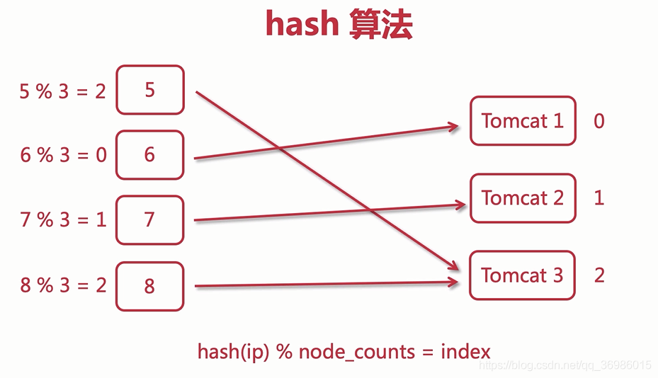 首先通过将ip地址映射成一个hash值,然后将hash值对Tomcat的数量3取模,得到Tomcat的索引0、1、2;