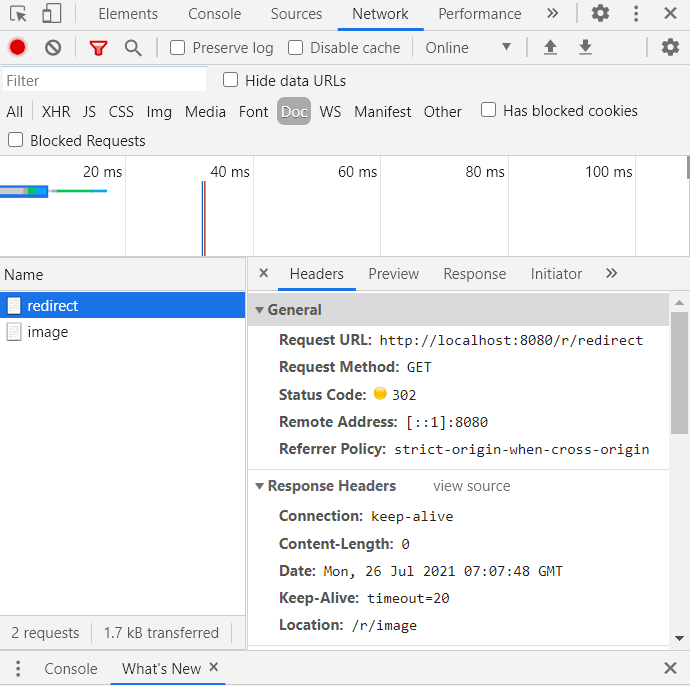 浏览器检查可以发现有两个请求,其中redirect的状态码302即重定向的状态码