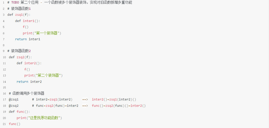 2、第二个应用 - 一个函数被多个装饰器装饰,实现对旧函数新增多重功能