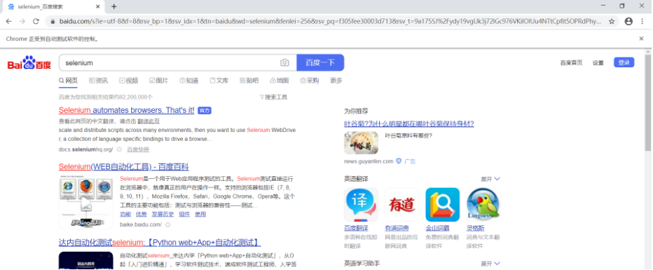 1 1 # 启动chrome浏览器 2 2 driver = webdriver.Chrome() 3 3 # 访问百度网站 4 4 driver.get("http://www.baidu.com") 5 5 # 查找输入框元素 6 6 ele = driver.find_element_by_id("kw") 7 7 # 在输入框中输入“selenium” 8 8 ele.send_keys("selenium") 9 9 # 查找百度一下按钮 10 10 ele = driver.find_element_by_id("su") 11 11 # 点击百度一下按钮 12 12 ele.click()
