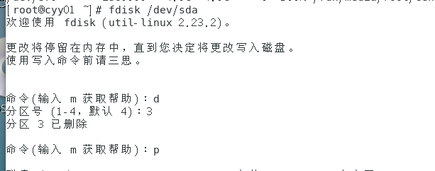① 选择 d,删除分区,这里我是删除3,你们按需输入