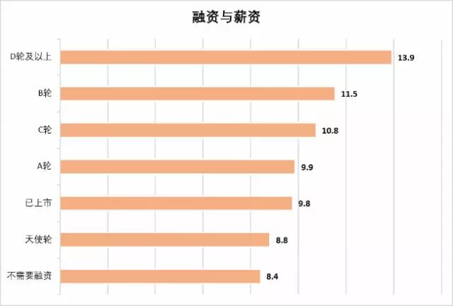 当然从未来往前看,现在给的薪水一定是廉价的,还要综合平台、资源、人脉、能力增值这些无形的东西做综合判断。融资到 B 轮和 D 轮的公司最豪爽融资到哪轮的公司,给工程师的薪资最高?D轮以绝对优势胜出,比较好理解在于一般融资到D轮的公司已经成为行业翘楚,高速发展。但是融资到B轮的公司给的薪酬也很高,这可能反映出国内创业公司的特点:终于拿到B轮了,逃过了A轮死,庆幸之余又有钱任性。