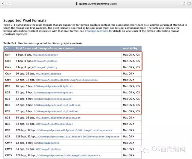 虽然,像素格式为YUV的视频解码后几乎都可生成灰度图。然而,并不是所有的图像原始数据都能通过Core Graphics生成可视图像,iOS支持的像素格式非常有限,如下所示。