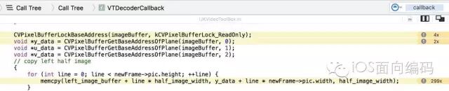 VideoToolbox解码后的图像数据并不能直接给CPU访问,需先用CVPixelBufferLockBaseAddress()锁定地址才能从主存访问,否则调用CVPixelBufferGetBaseAddressOfPlane等函数则返回NULL或无效值。值得注意的是,CVPixelBufferLockBaseAddress自身的调用并不消耗多少性能,一般情况,锁定之后,往CVPixelBuffer拷贝内存才是相对耗时的操作,比如计算内存偏移。如果CVPixelBuffer的图像需要显示在屏幕上,建议用GPU实现图像处理操作。下面展示读写左半图像时的性能损耗(请忽略内存计算的粗暴代码)。