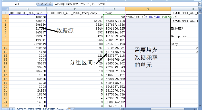 3.计算数据源在分组区间内的频率;选中需要填充频率的单元格;按F2输入公式,FREQUENCY(D2:D75081,F2:F279),第一个参数为数据源,第二个参数为分组区间。按住“Ctrl”和“Shift”两个键,再按“回车Enter”键,完成。