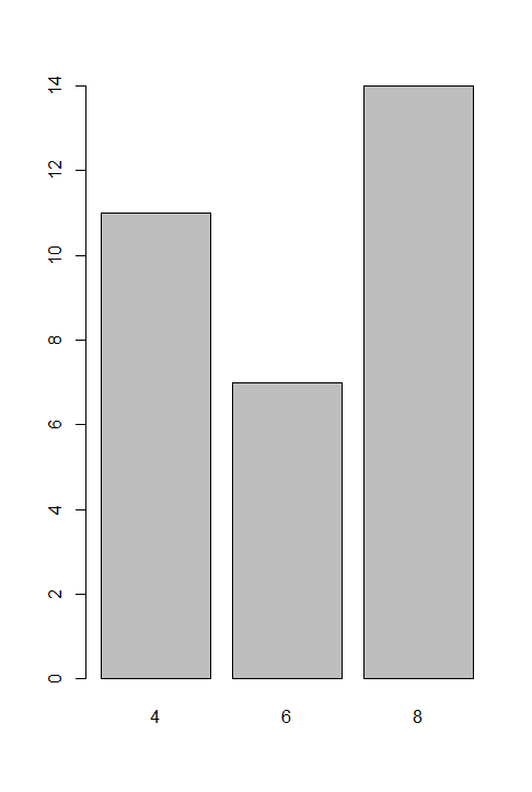 > mtcars$cyl [1] 6 6 4 6 8 6 8 4 4 6 6 8 8 8 8 8 8 4 4 4 4 8 8 8 8 4 4 4 8 6 8 4 > table(mtcars$cyl) #使用table()进行频数统计 4 6 8 11 7 14