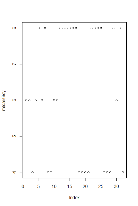 > plot(mtcars$cyl) #左图 > plot(factor(mtcars$cyl)) #右图