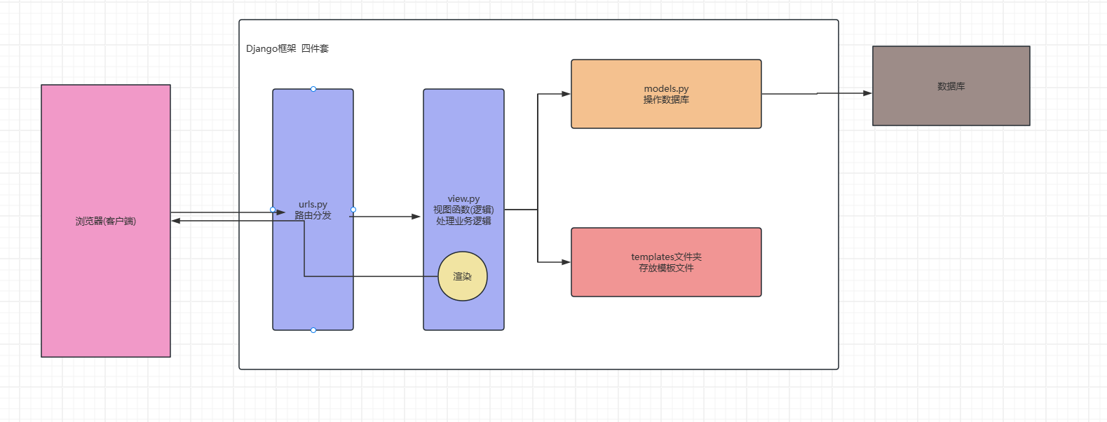 现在是一个最简单的流程建立起来了,包含了一个路由分发,有视图函数,不过没有数据库部分、页面渲染部分。