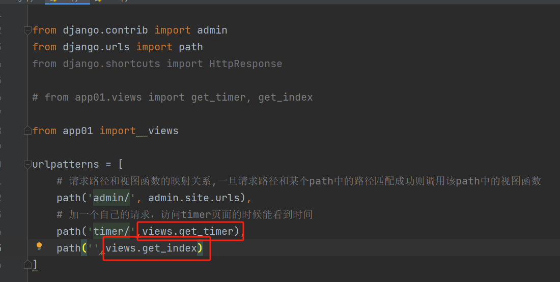 以上的案例没有解耦合,我们只需要将urls.py里涉及视图函数的代码放到对应应用的views.py里,再在urls.py里引用这些views.py即可: