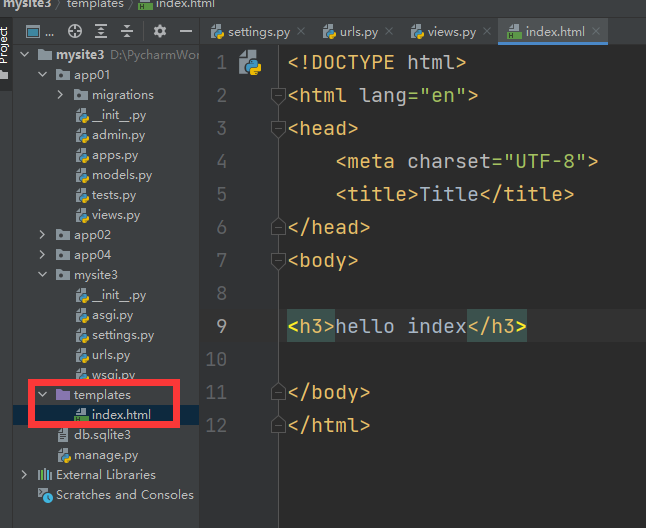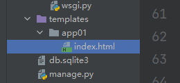 那么如果我们在templates如果也想完成一个解耦,也就是在templates文件夹里给每个应用新建一个文件夹,比如上文的index.html放入app01文件夹里,那么我们的return render(request, "index.html")就需要改一下了,不然就找不到咯(render只能找到templates文件夹下的)(不过其实我们的pycharm会自动给我们补全这个路径return render(request, "app01/index.html"),它补你也别太依赖,还是要自己理解一下的)。