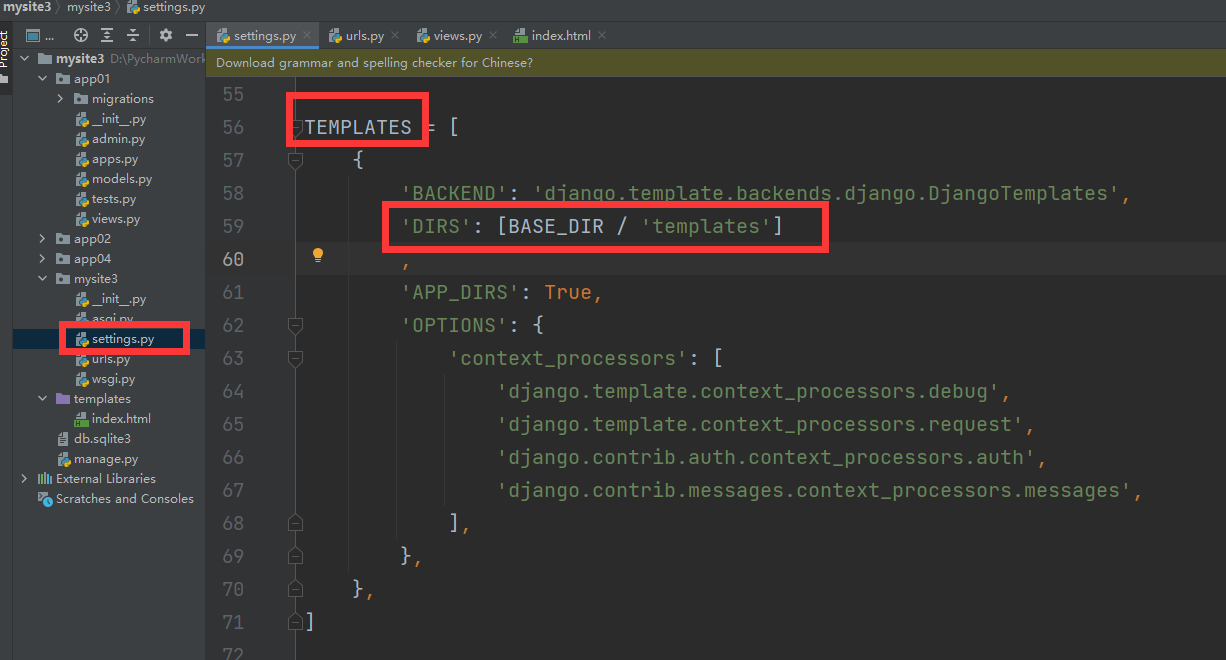 关于render怎么找到模板文件index.html的:通过配置文件。在我们的项目里,有一个全局文件,与项目名同名叫mysite3,里面有个叫settings.py的配置文件,配置文件里有个TEMPLATES,里面的DIRS,这个就是render函数在找的时候的指定路径: