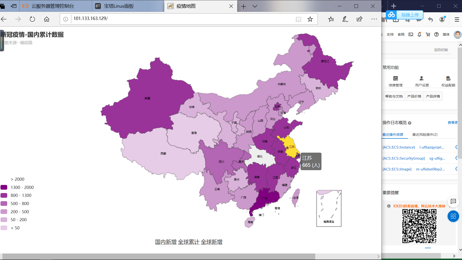 <%@ page session="false" import="java.net.URL,java.net.URLConnection,java.io.InputStream,java.io.BufferedReader,java.io.InputStreamReader" pageEncoding="UTF-8" contentType="text/html; charset=UTF-8" %> <!DOCTYPE html> <html lang="en"> <head> <meta name="viewport" content="width=device-width, initial-scale=1"> <meta charset="UTF-8"> <title>疫情地图</title> <script type="text/javascript"> <% //1. 创建一个URL类的对象url URL url = new URL("https://zaixianke.com/yq/all"); //2. 通过URL类的对象url打开网络连接 , 并得到连接对象conn URLConnection conn = url.openConnection(); //3. 通过连接对象 , 得到用于读取网页内容的输入流is InputStream is = conn.getInputStream(); //4. 将上述的字节流is 装饰为字符流 , 将字符流再装饰为一次能读取一行的字符流br BufferedReader br = new BufferedReader(new InputStreamReader(is,"UTF-8")); //5. 通过字符流br,读取一行内容,并将内容存储到变量text中 String text = br.readLine(); //6. 可以将读取到的内容text 输出显示到模板中 //System.out.println(text); %> var data = <%=text%>; </script> <script src="https://cdn.bootcss.com/jquery/3.4.1/jquery.min.js"></script> <script src="https://cdn.bootcss.com/echarts/4.7.0/echarts.min.js"></script> <script src="http://cdn.zaixianke.com/china.js"></script> <script src="http://cdn.zaixianke.com/world.js"></script> </head> <body> <div id="main" style="width: 100%;height:600px;"></div> <br> <div style="text-align:center"> <a style="color:#333" class="control" align="center" href="javascript:updateMap(0)">国内累计</a> <a style="color:#333" class="control" align="center" href="javascript:updateMap(1)">国内新增</a> <a style="color:#333" class="control" align="center" href="javascript:updateMap(2)">全球累计</a> <a style="color:#333" class="control" align="center" href="javascript:updateMap(3)">全球新增</a> </div> <script src="control.js"></script> </body> </html>