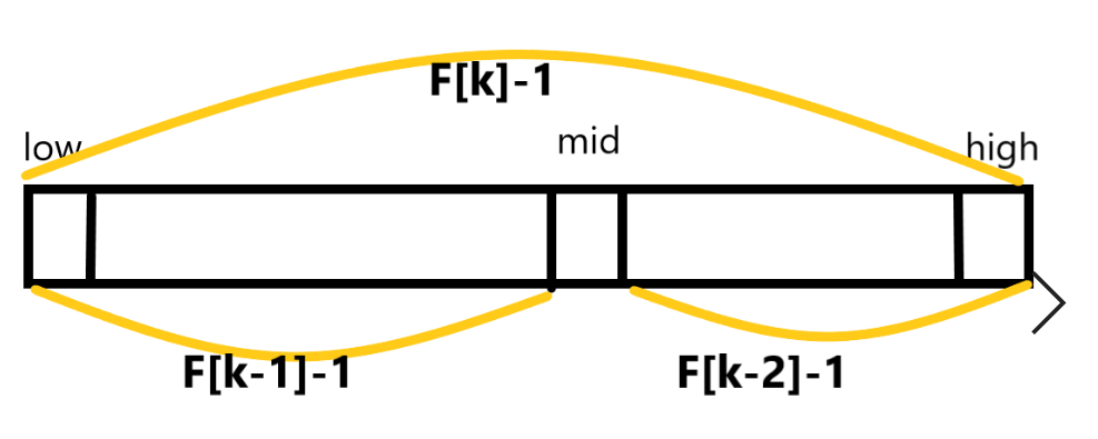 1)由斐波那契数列F[k]=F[k-1]+F[k-2]的性质,可以得到 (F[k]-1)=(F[k-1]-1)+(F[k-2]-1)+1。该式说明:只要顺序表的长度为F[k]-1,则可以将表分成长度为 F[k-1]-1 和F[k-2]-1 的两段。如下图。从而中间位置为mid=low+F[k-1]-1。
