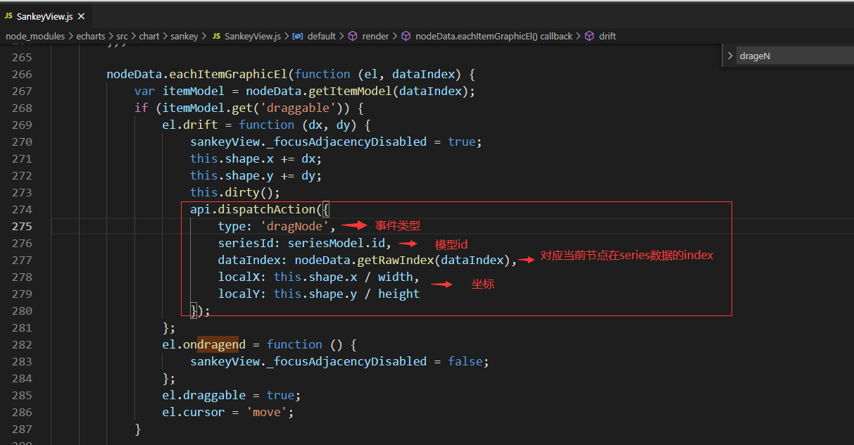 let seriesModel = this.sanChart.getModel().getSeriesByIndex(dataIndex) // 由于只有一个图,所以序列index是0 let nodeData = seriesModel.getData() let shape = nodeData._graphicEls[dataIndex].shape // 我要拖动的节点是我数据的第一个,所以index也是0