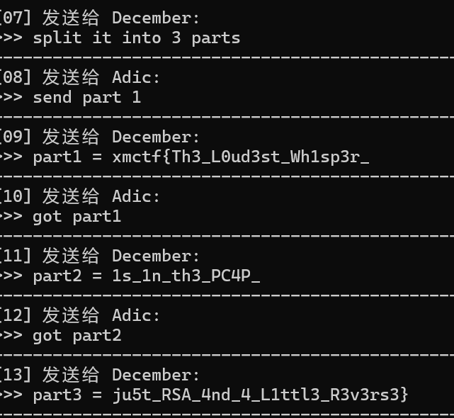 主要复盘一下这个师兄出的也是最少解的题吧 xmctf{Th3_L0ud3st_Wh1sp3r_1s_1n_th3_PC4P_ju5t_RSA_4nd_4_L1ttl3_R3v3rs3}