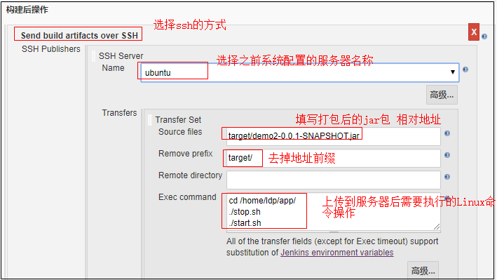 构建后操作的意思是,jar打包好后,要将jar发送到哪里去,发送后去和启动等