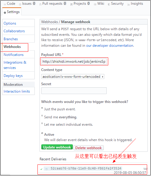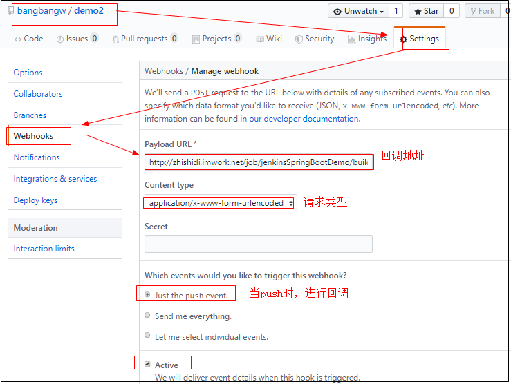在GitHub服务器上的指定项目里面配置上文中提到的回调地址