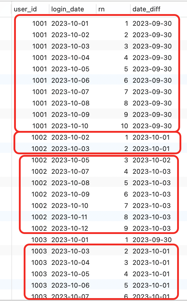 思路:我们将每个用户登陆信息按照时间排序,然后用(登陆时间-序号),会发现如果连续的情况,每次差值都是一样的,根据这个规律很容易能想到相同差值的个数即为连续登陆的天数