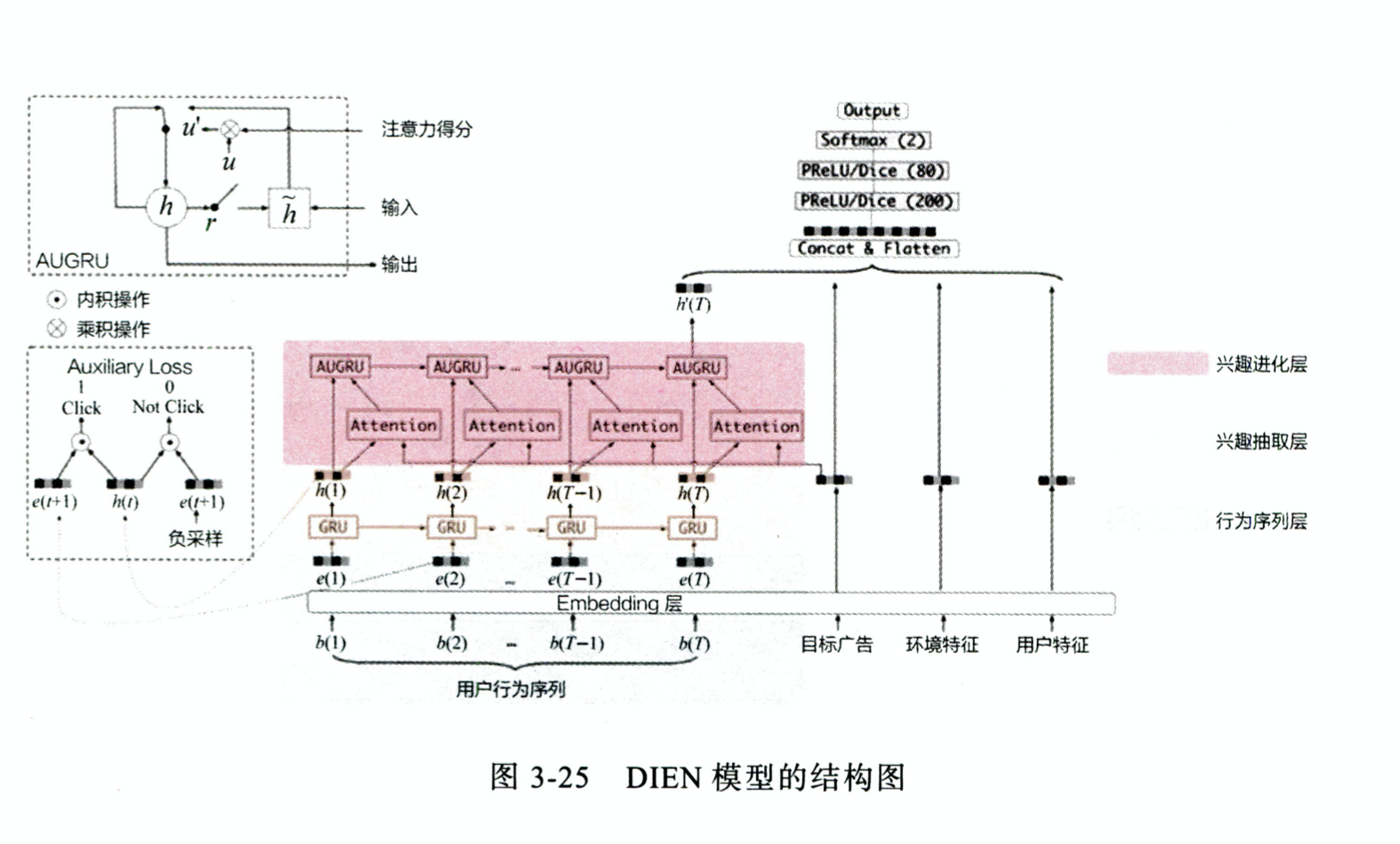 兴趣进化层;在兴趣抽取层加入attention (AUGRU:更新门要引入attention得分)