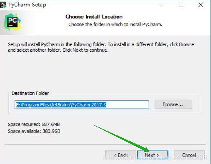 3. 选择安装目录,Pycharm需要的内存较多,建议将其安装在D盘或者E盘,不建议放在系统盘C盘