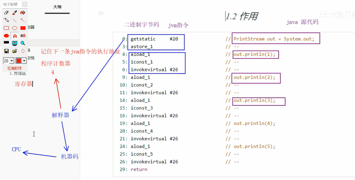 二进制字节码通过解释器被解释为机器码,然后机器码才能够交给CPU去执行。