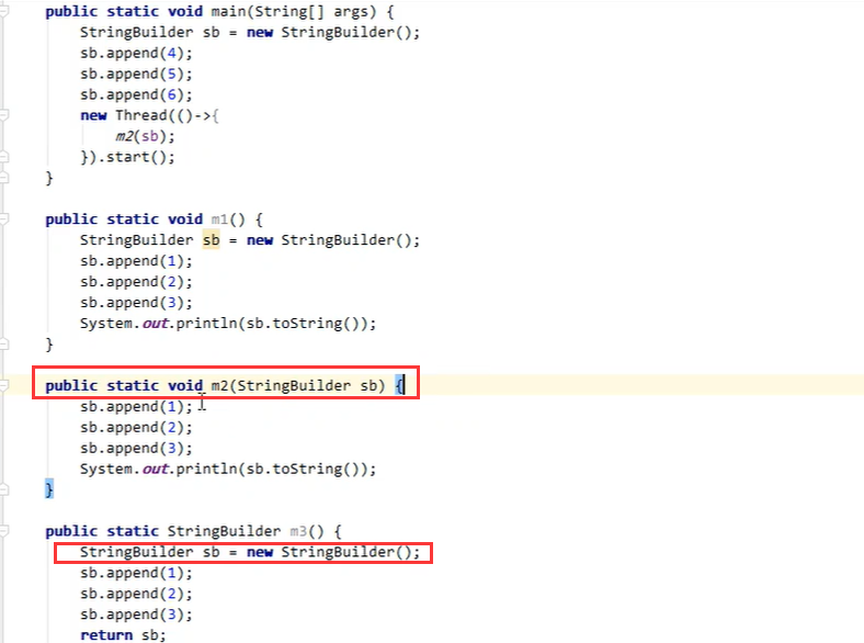 方法2中的不是线程安全的,因为作为引用类型出现它可能还会被其它线程所引用,比如说在main 方法中开启了新线程调用 m2(StringBuilder sb)方法。