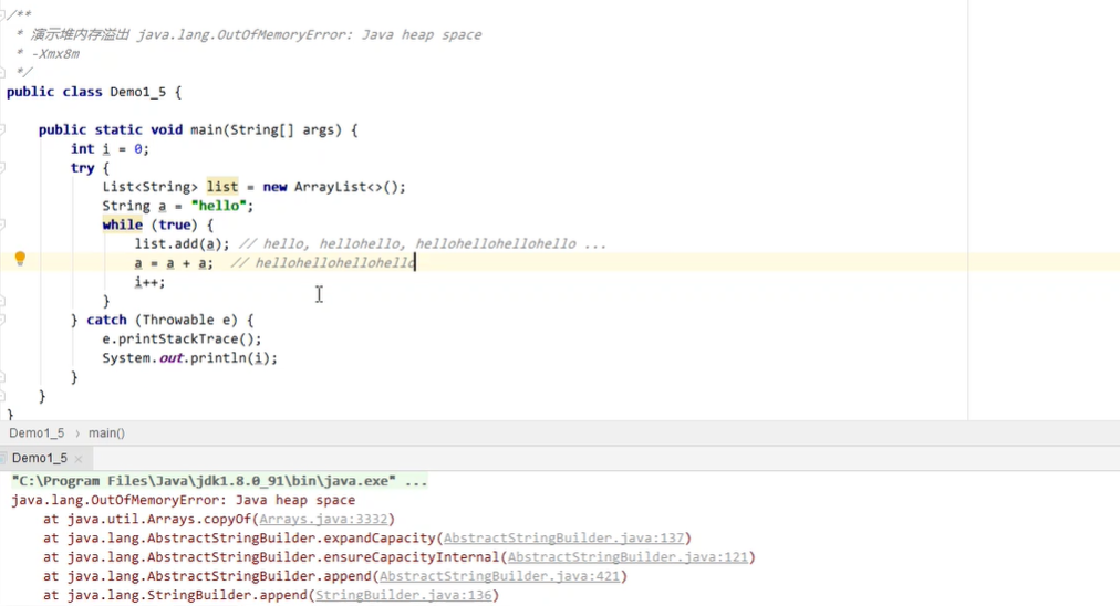 如图所示,此时报错 Java heap space 堆空间不足,证明1.8中 StringTable位于堆中。