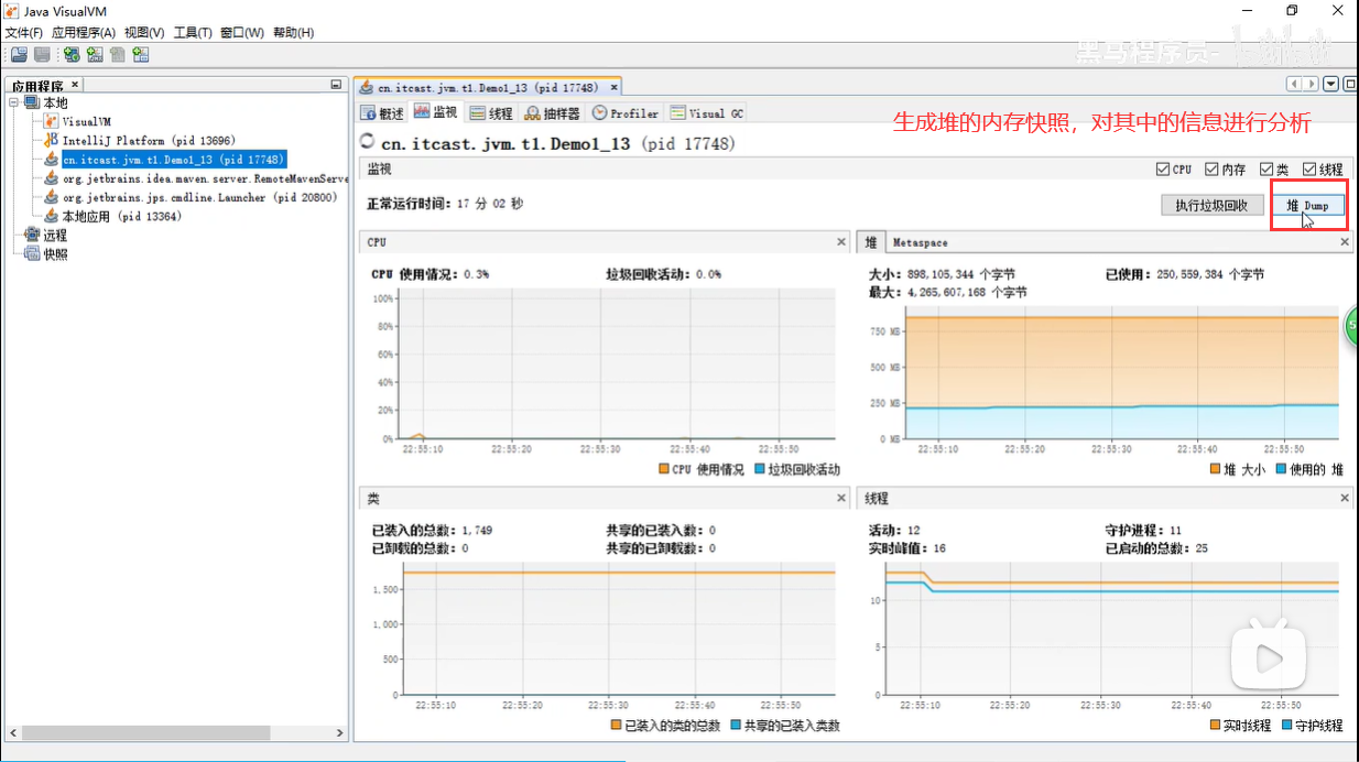 - jconsole 工具:图形界面的,多功能的监测工具,可以连续监测;