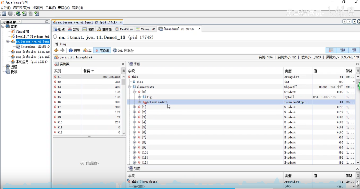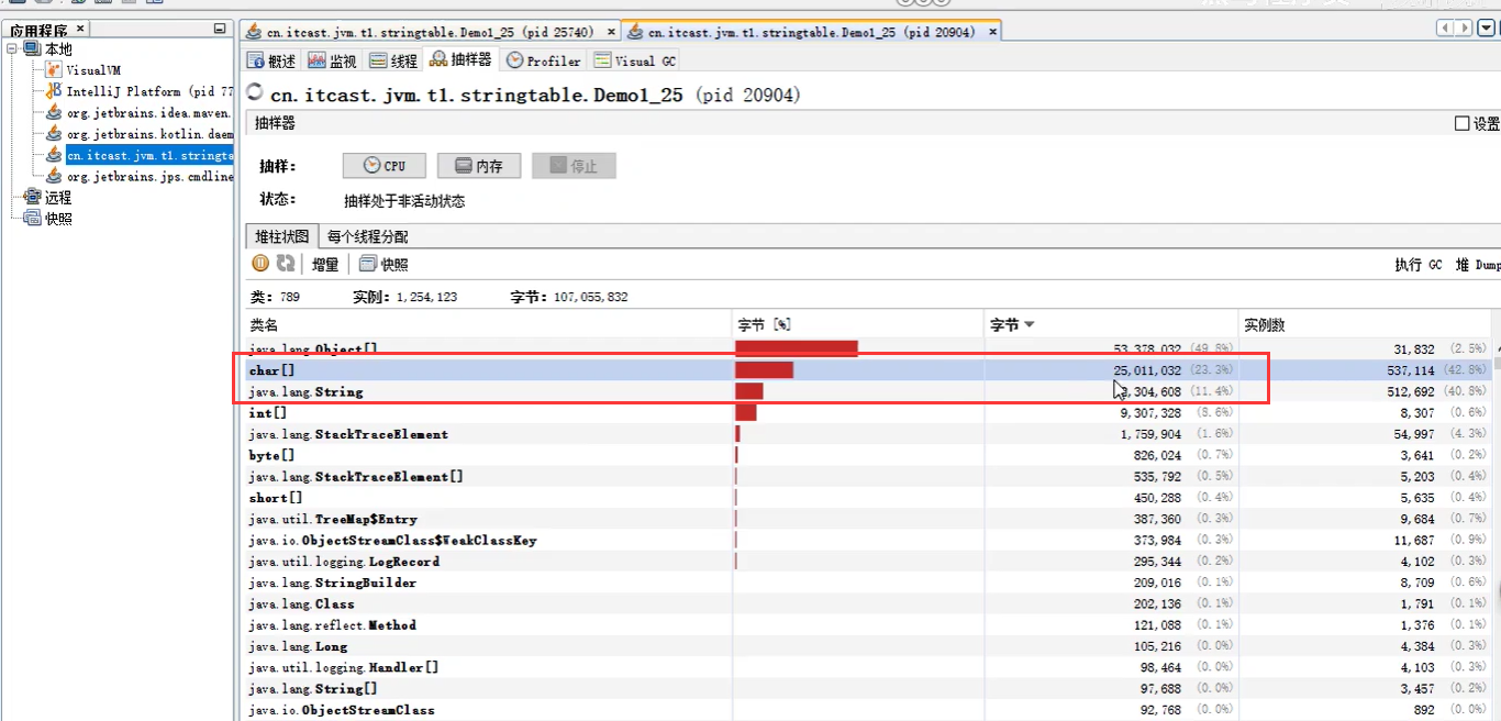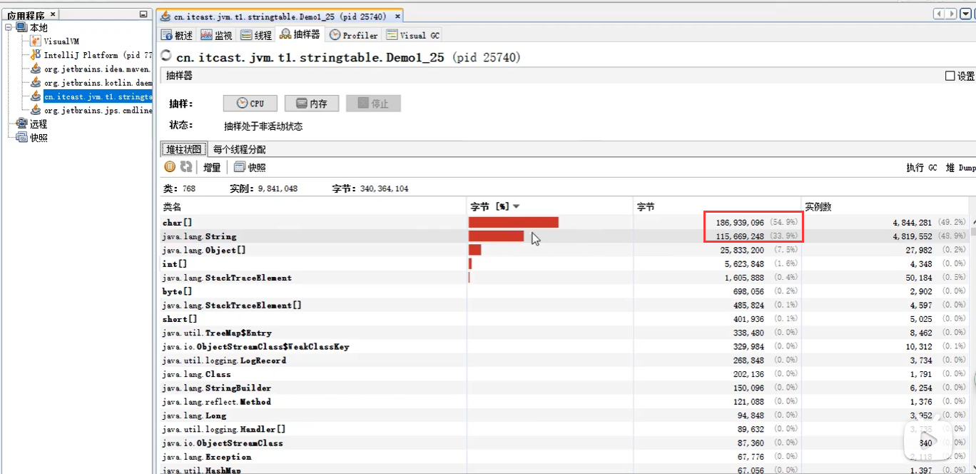 打开 jvisualvm可以发现String、char数组占用了80%的内存;