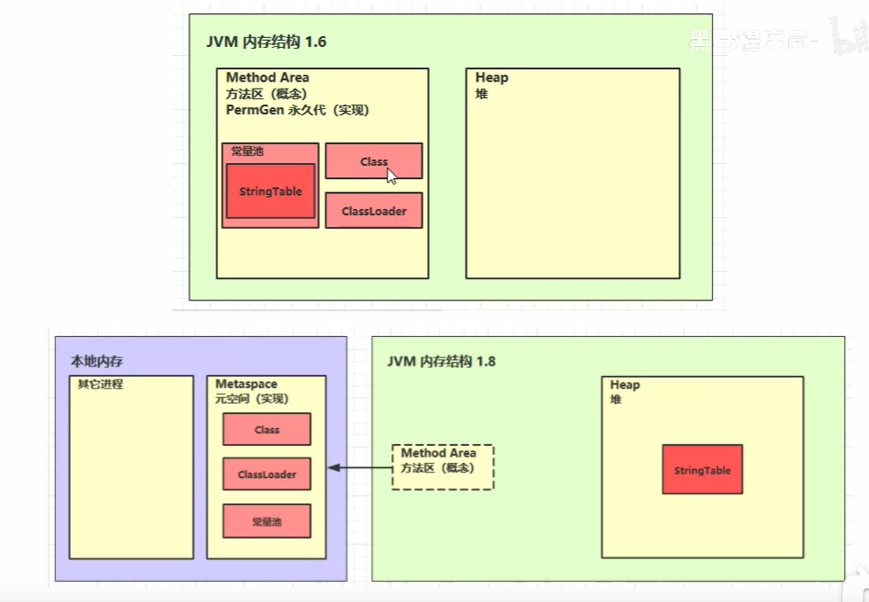 StringTable)、类加载器(ClassLoader)、类的相关信息(Class); - jvm1.8 后用元空间代替了永久代作为方法区的实现。元空间和方法区类似,都是对JVM中方法区的实现,不过元空间与永久代的最大区别在于:元空间不在虚拟机设置的内存中、而是使用本地内存(永久代更容易遇到内存溢出的问题,而元空间只要没有触碰到进程可用的内存上限就不会有问题)。不过1.8将 StringTable移动到了堆中。这是因为永久代的回收效率很低(需要 FULLGC时才能触发垃圾回收 )这样会占用大量的内存,而StringTable在堆中只需要 Minor GC时便能够触发垃圾回收,能够大大减轻字符串对内存的占用。