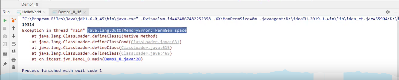 方法区的大小决定了系统可以保存多少个类,如果系统定义了太多的类,导致方法区溢出,虚拟机同样会抛出内存溢出错误: