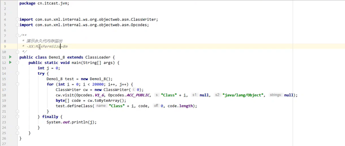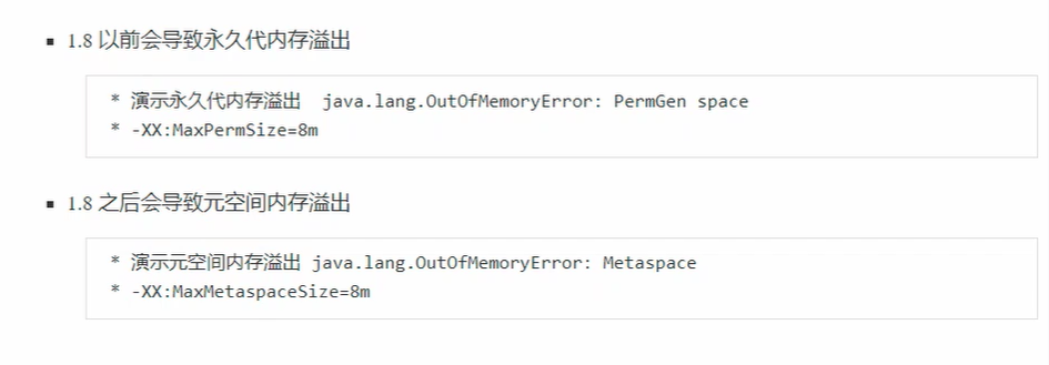 但是只有在 JVM1.6之前才有可能产生方法区内存溢出,因为它使用的是虚拟机的内存,而JVM1.8以后使用的是本地内存很大不会溢出。但是在修改了虚拟机参数后可以做到内存溢出。 -XX:MaxMetaspaceSize=8m