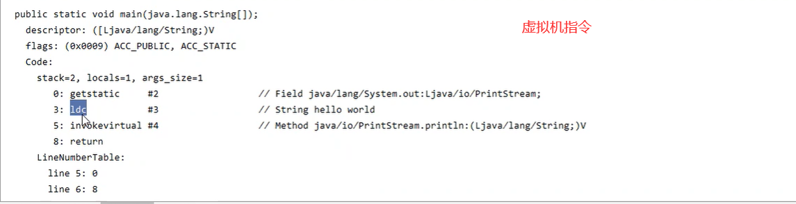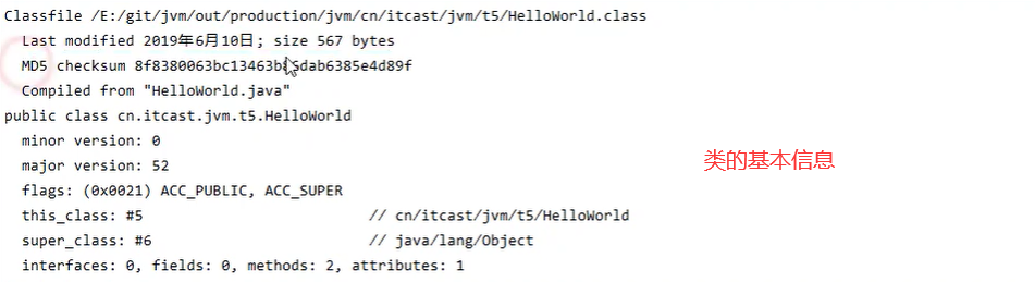 - 字节码文件中包含了 类的基本信息(版本号、字段),常量池,类方法定义,虚拟机指令。 查看字节码信息: