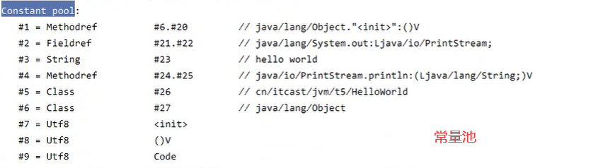 - 常量池就是一张表,字节码文件中的虚拟机指令根据这张表找到需要执行的类名、方法名、参数类型、字面量等信息。