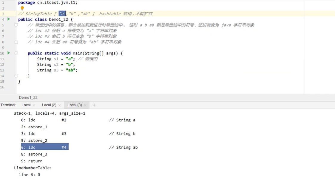 常量池中的信息,都会被加载到运行时常量池中。开始时 a、b、ab 都是作为常量池中的符号,还没有变为 java字符串对象。等到程序运行到这里时,字节码中的虚拟机指令(ldc)会将该符号变为字符串对象,并且放入到串池(StringTable,是一个 hashtable结构,不能扩容)中。每次都会先到串池中检查是否有对应的字符串,如果不存在再创建然后加入。 -