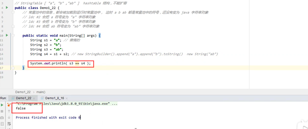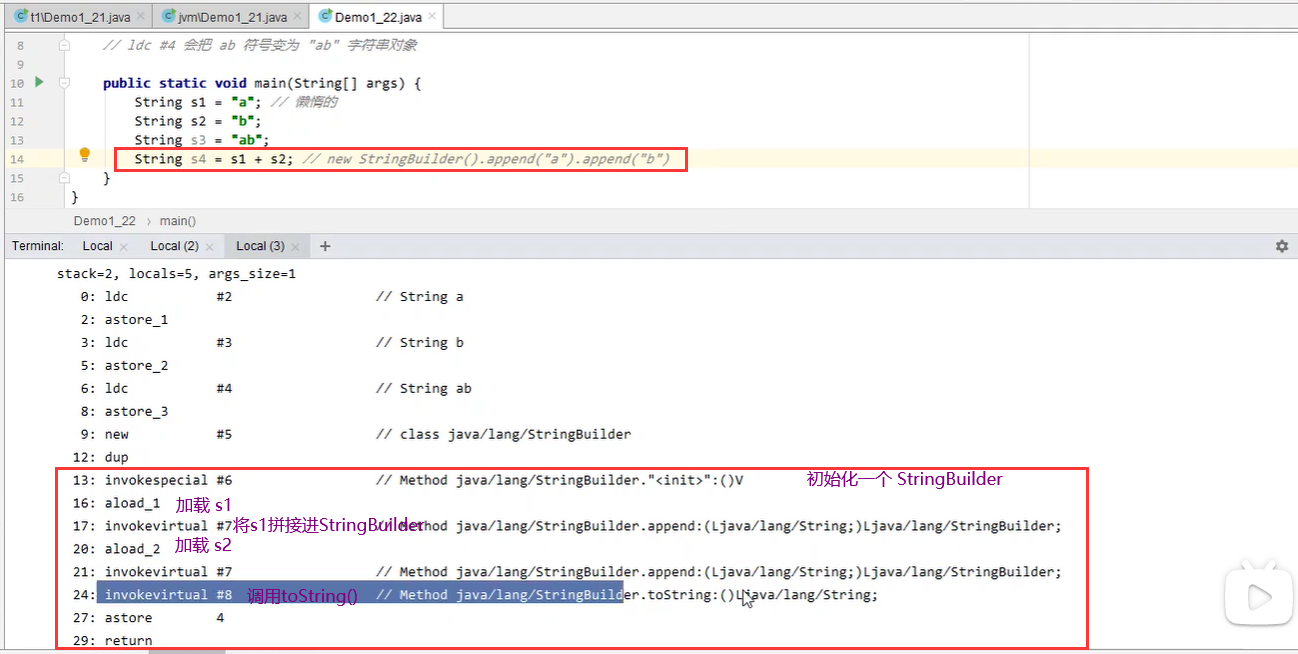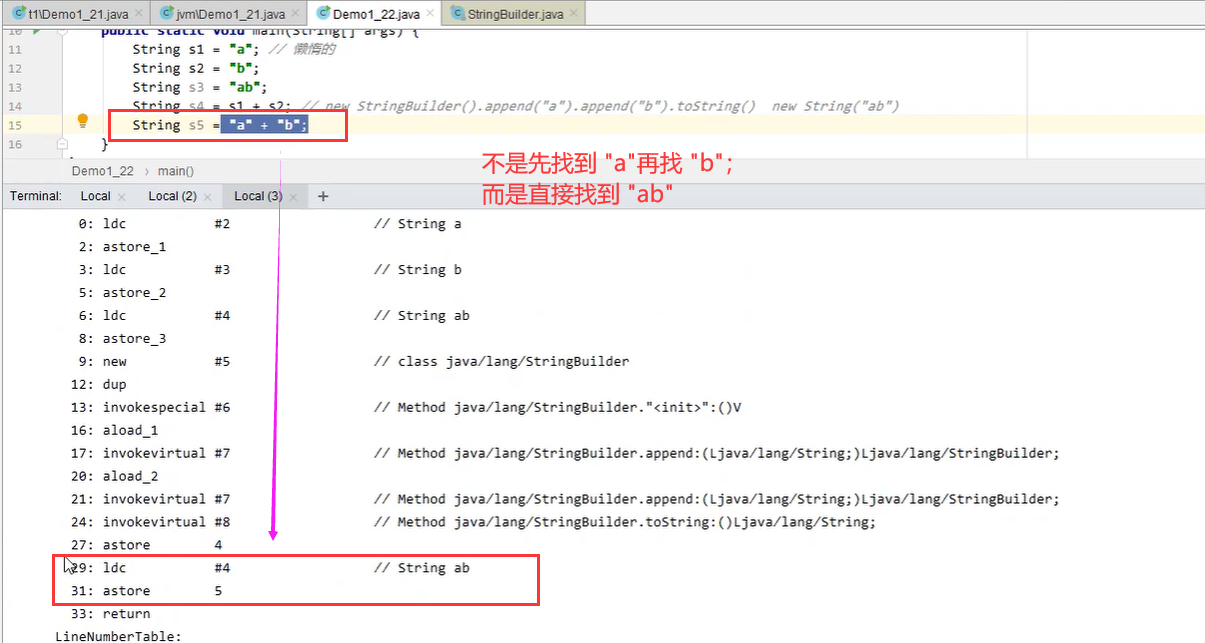 底层做法:javac在编译期间的优化,结果已经在编译期间确定为 "ab";而String s4 = s1 + s2中s1与 s2均为变量可能在之后发生变化,因此不能提前确定,必须在运行期间使用StringBuilder获取。 -