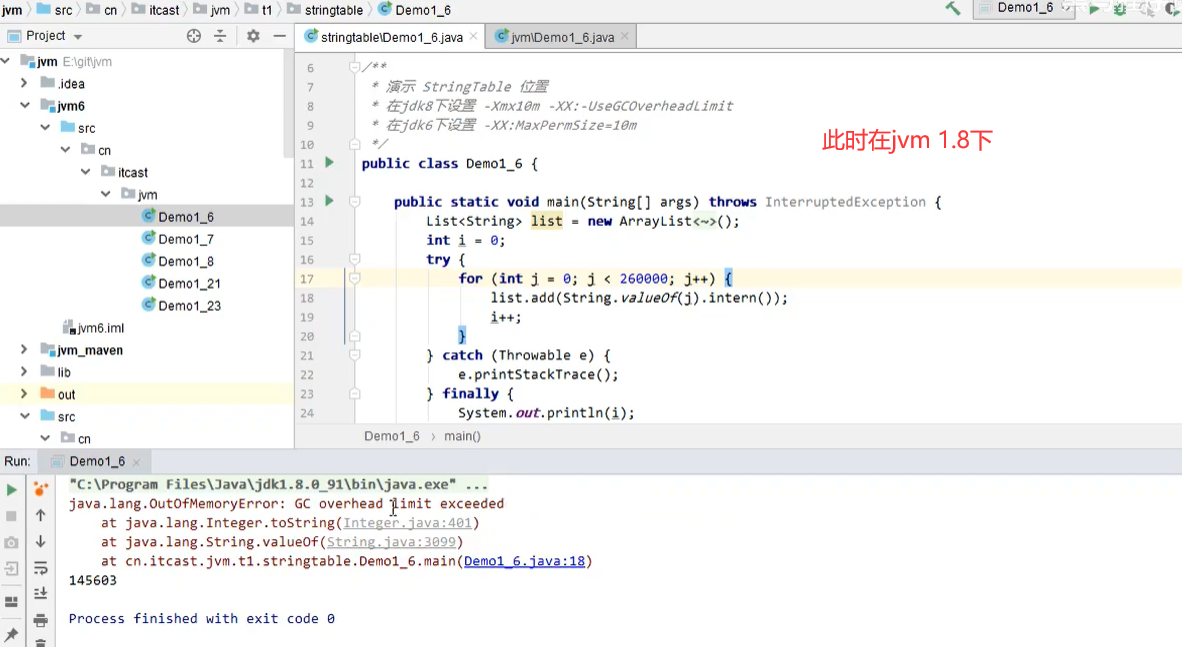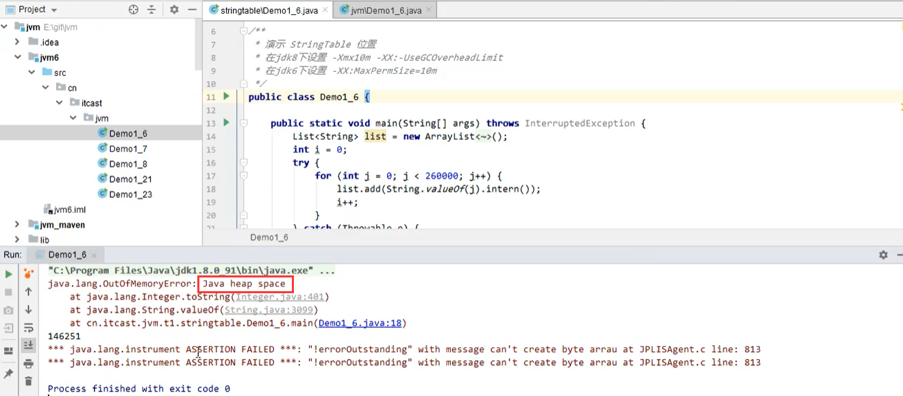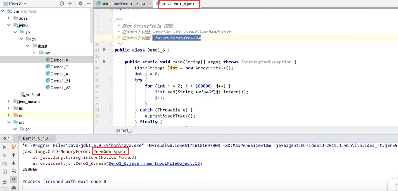 jvm1.6 下循环26000次往 StringTable中放入字符串,同时设置永久代的最大内存空间:-XX:MaxPermSize=10m;